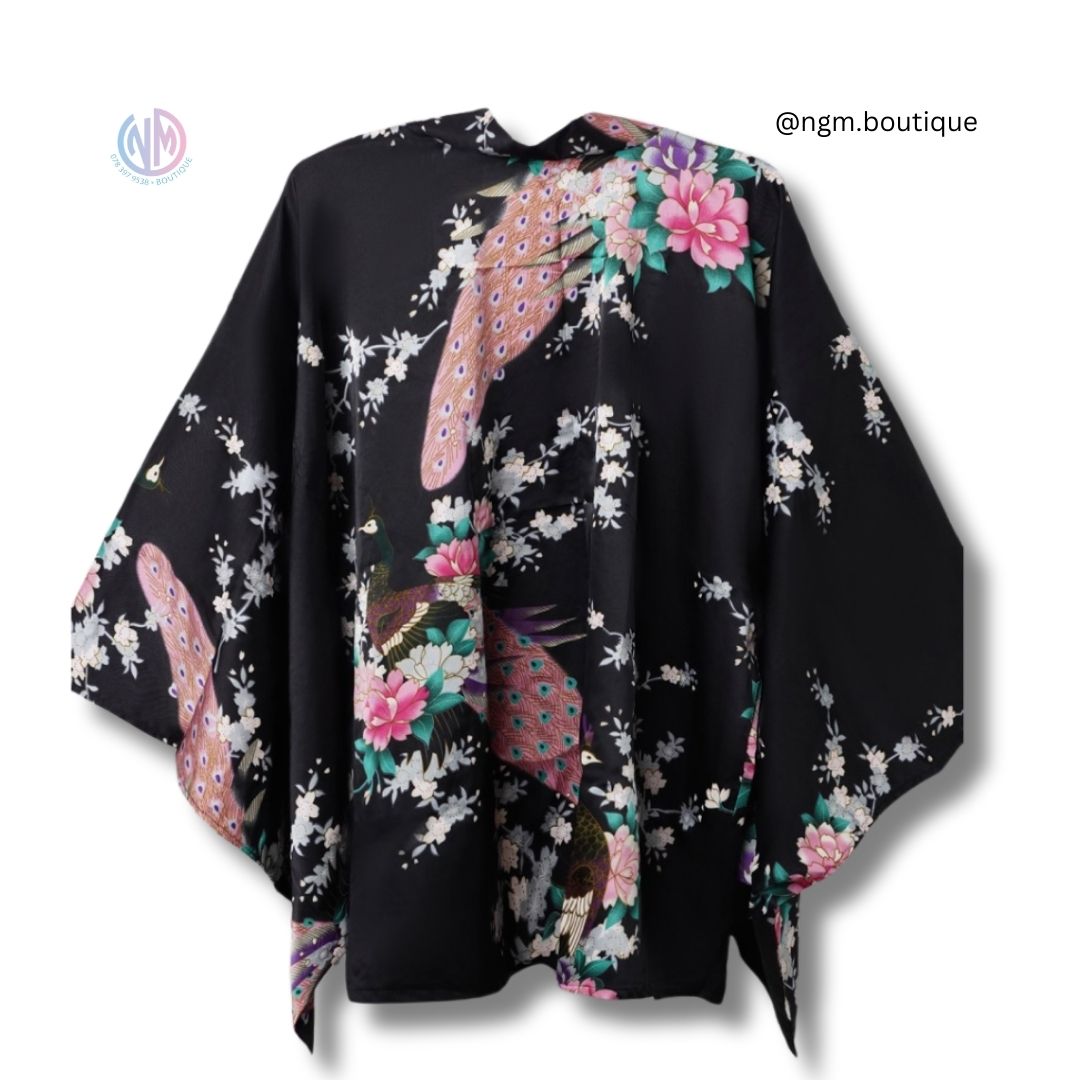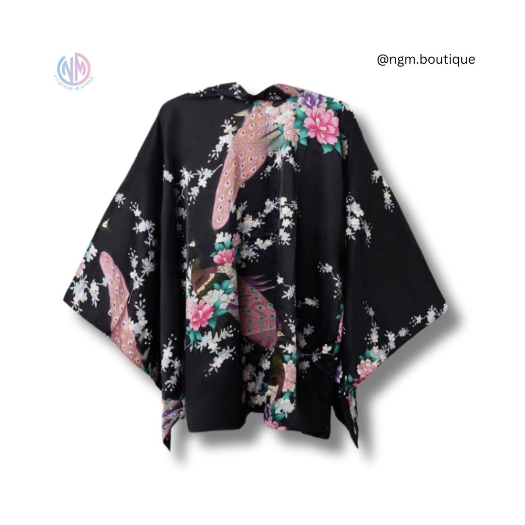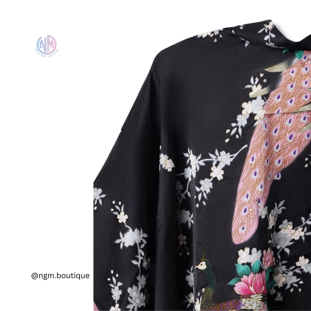 Embrace the exquisite beauty and timeless elegance of traditional Japanese attire with our Black Blossom Peacock Japanese Kimono. This stunning piece features a deep black background adorned with intricate floral patterns and majestic peacocks, combining sophistication with cultural heritage.
