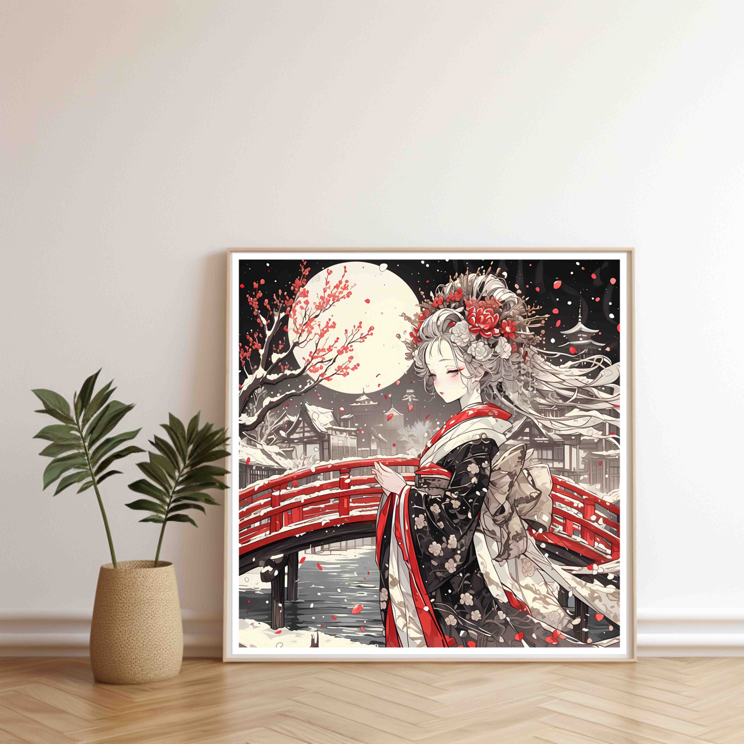 Transform your space with the tranquil elegance of our Serenity in Bloom poster, featuring a mesmerizing geisha standing gracefully on a red bridge under the serene glow of a full moon. The delicate cherry blossoms and traditional architecture in the background evoke a sense of peaceful reflection, while the gentle snow adds a calming touch of winter magic.