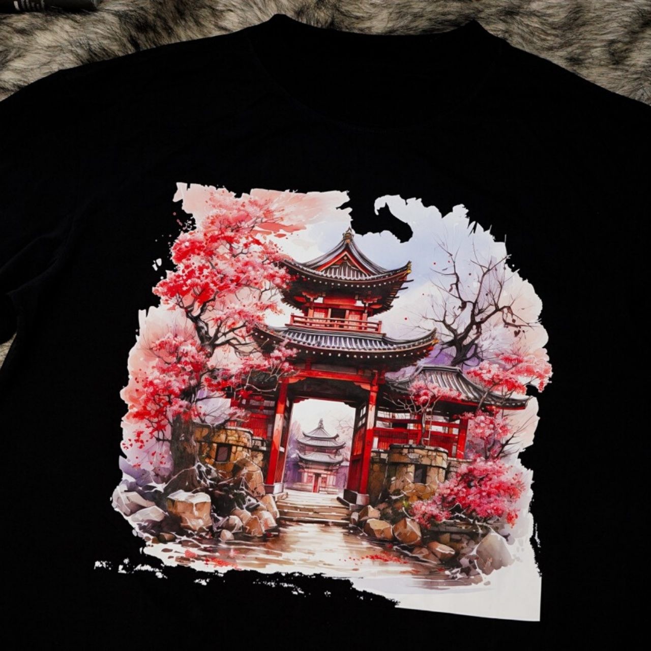 - Elegant Design: The stunning temple gateway graphic, surrounded by cherry blossoms, adds a touch of serenity and artistry to your wardrobe.