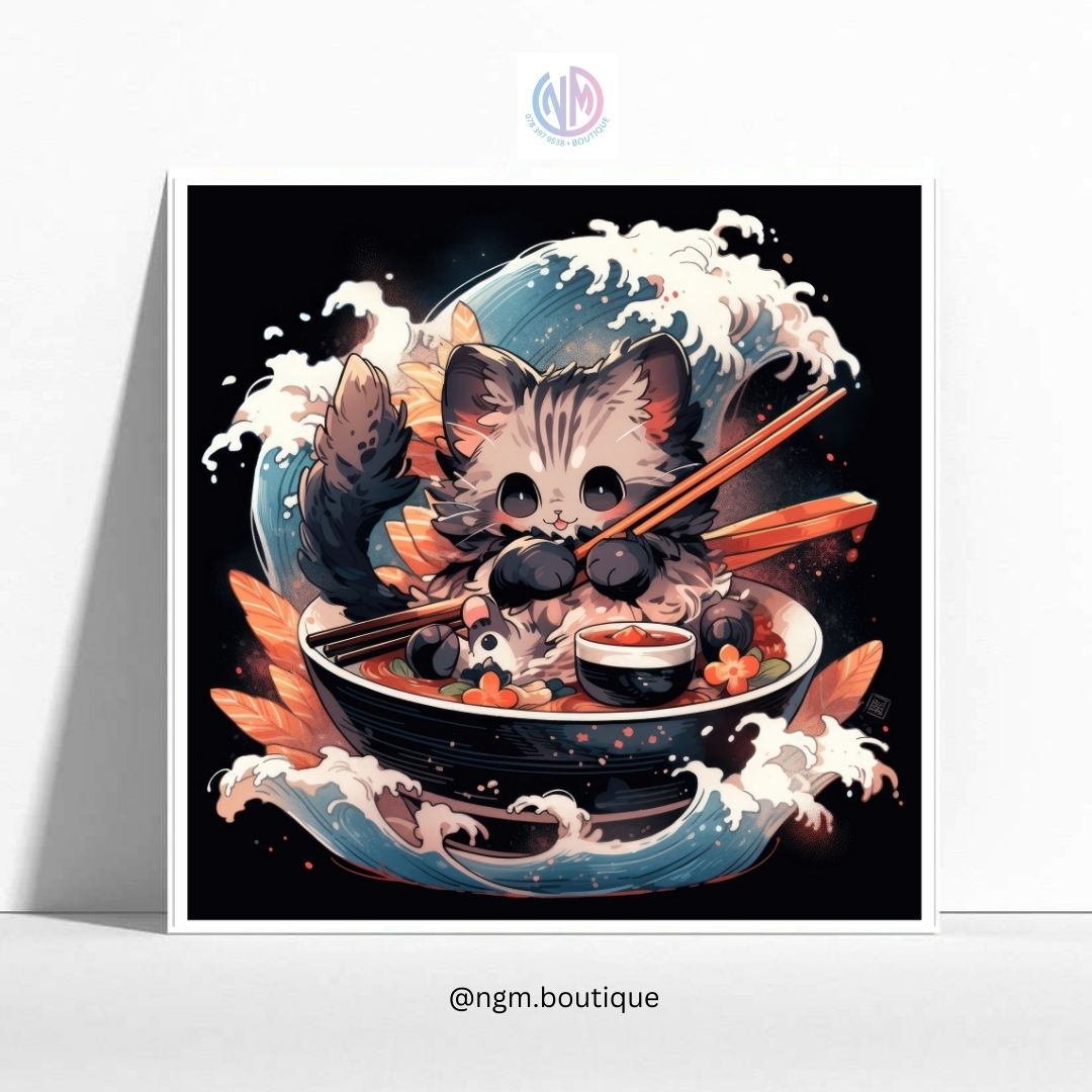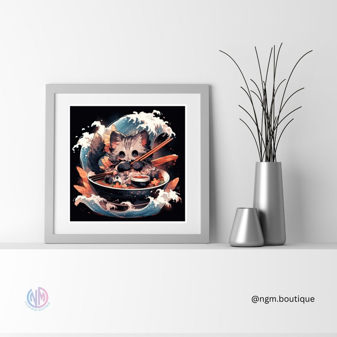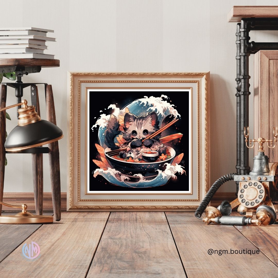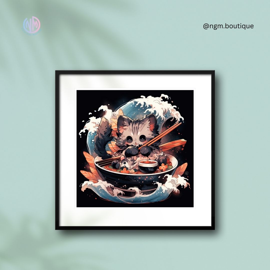 - Adorable Design: The poster features an enchanting illustration of a kitten playfully nestled in a bowl of noodles, with vibrant colors and intricate details that bring the scene to life.