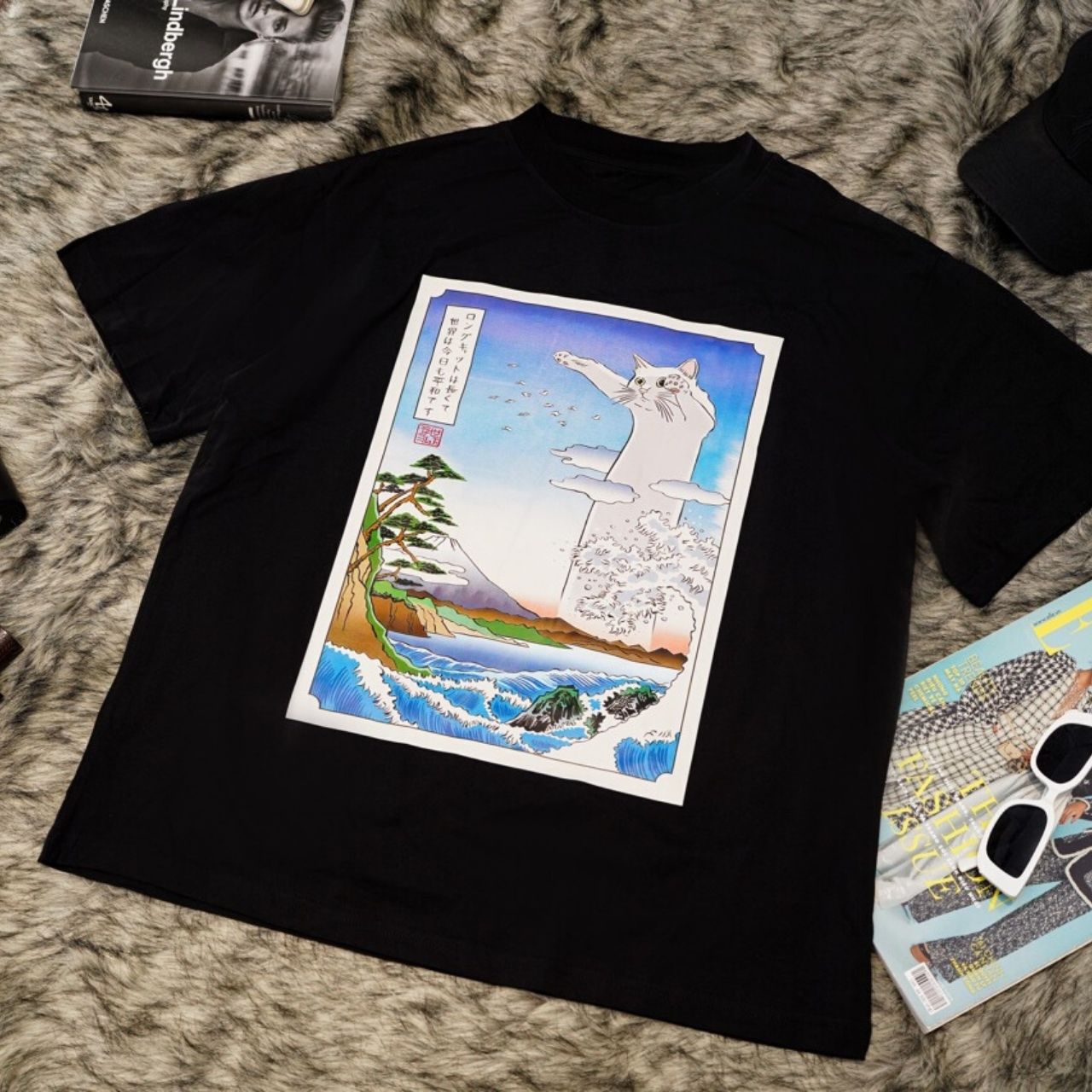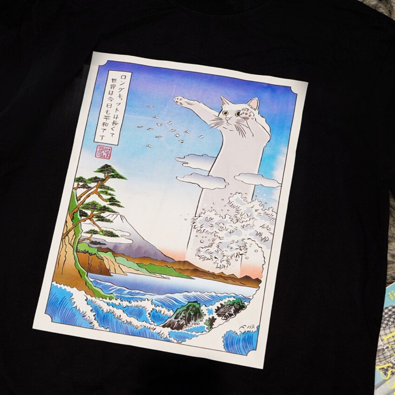 - Design Fantaisiste : Le graphisme du chat géant joueur, sur un paysage japonais magnifiquement détaillé, ajoute une touche unique et artistique à votre garde-robe.