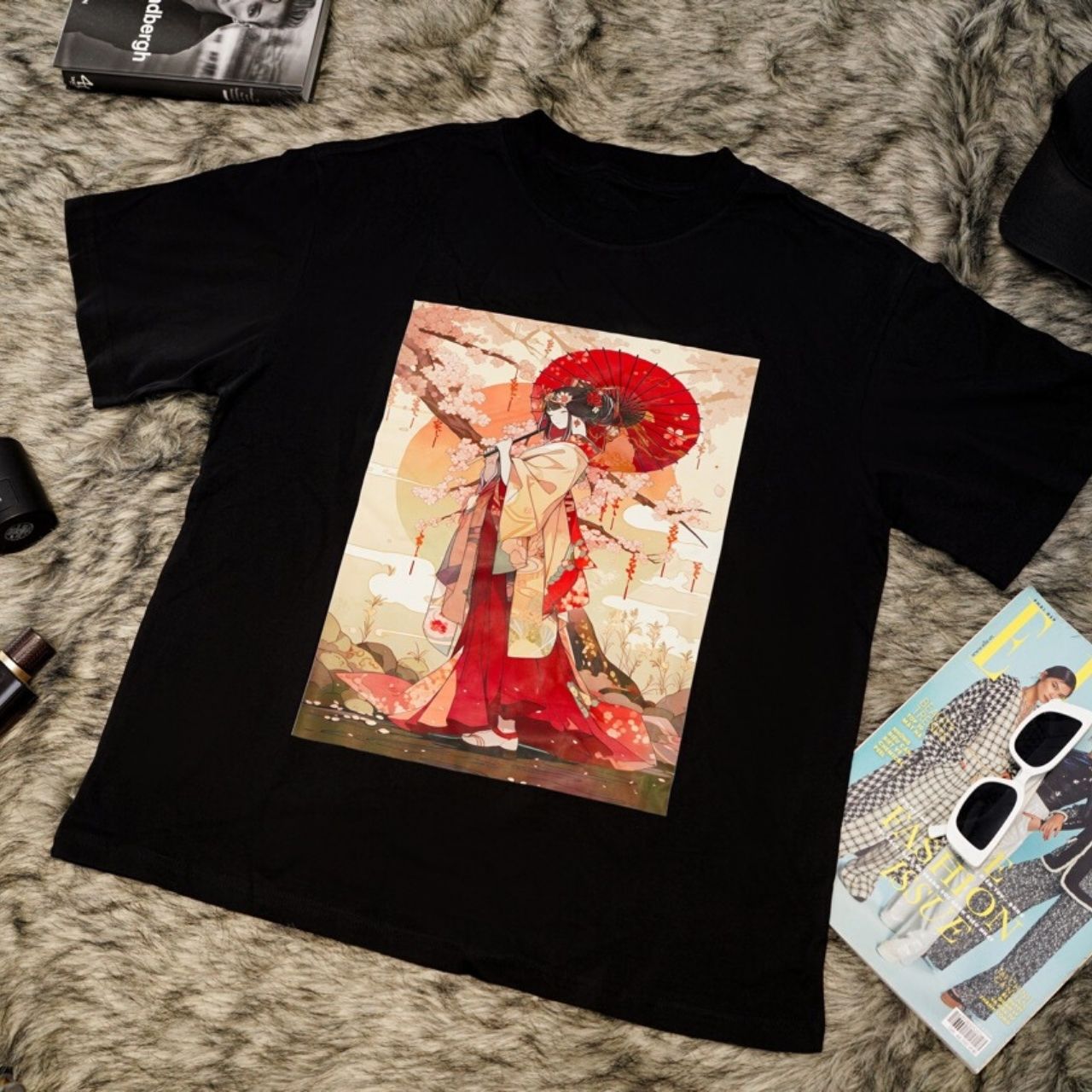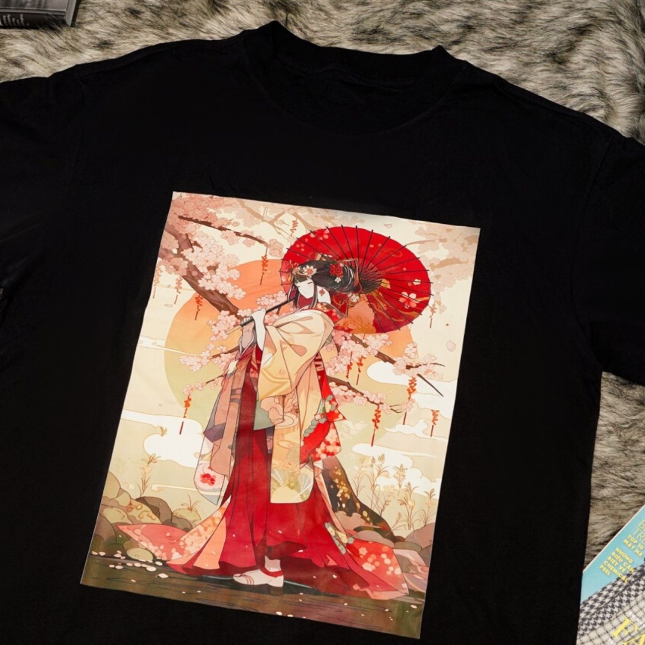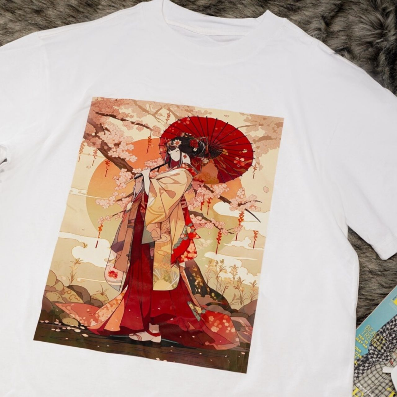 - Design Gracieux : Le magnifique graphisme de la geisha, entouré de cerisiers en fleurs et de couleurs douces, ajoute une touche d’élégance et d’art à votre garde-robe.