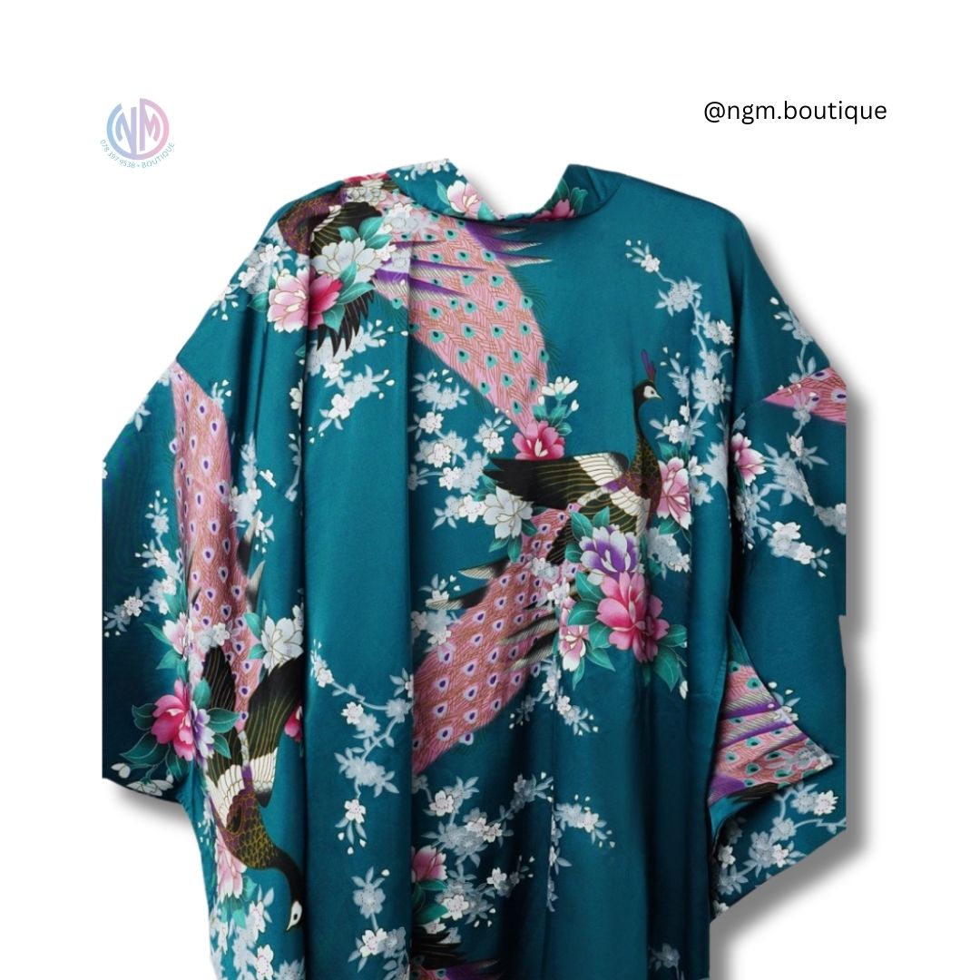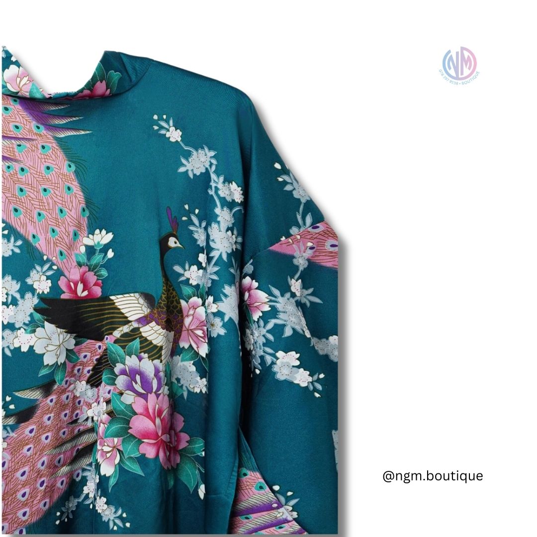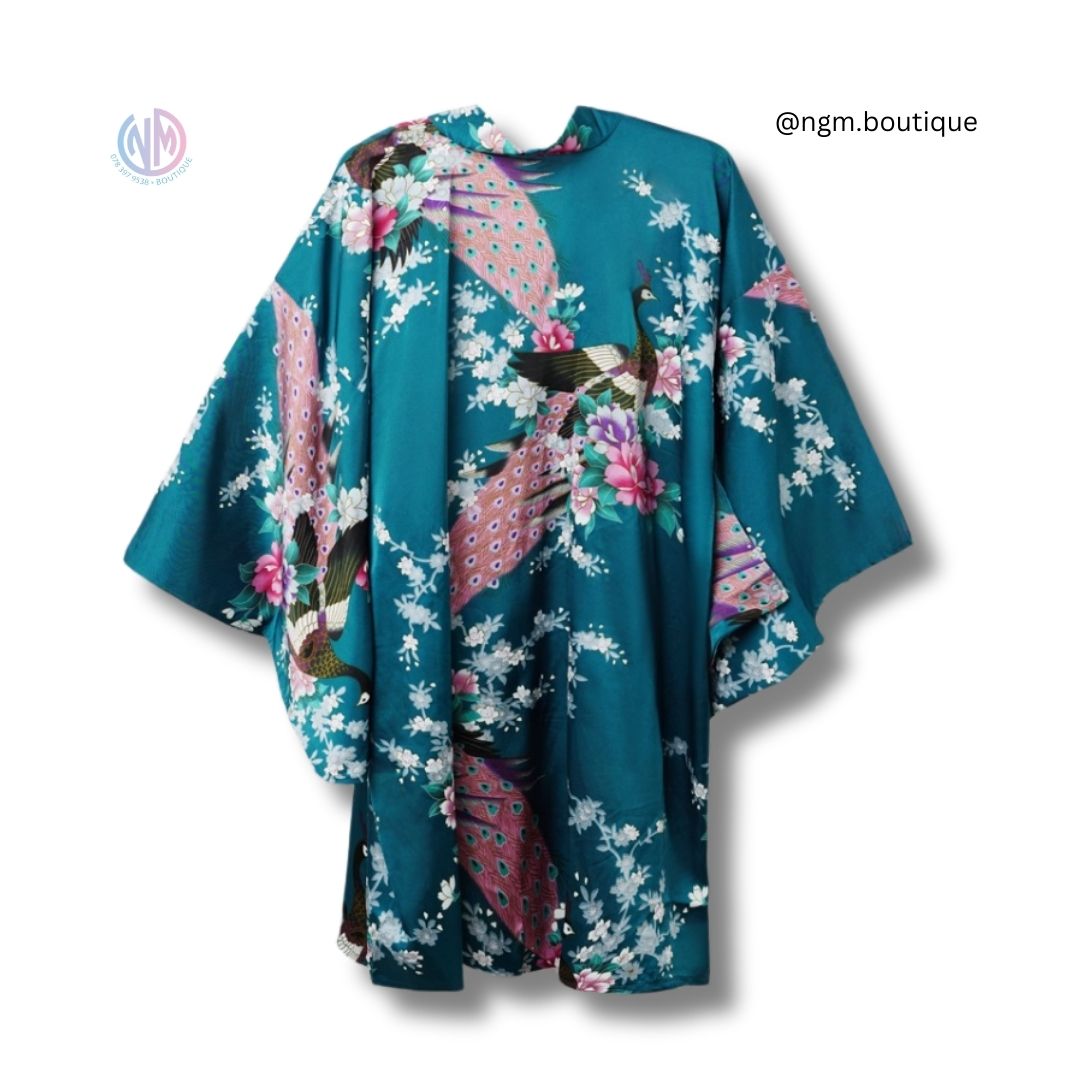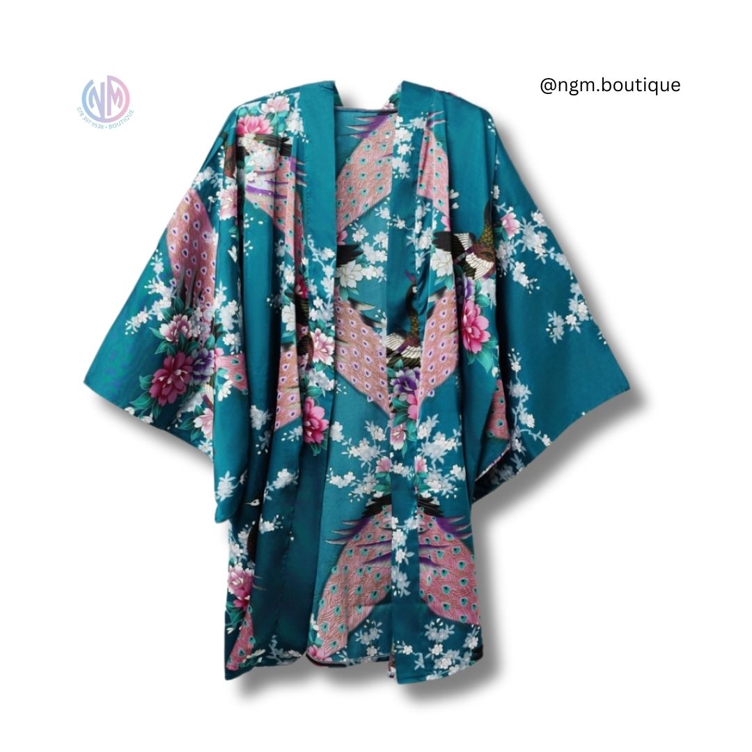 - Design Intricate : Le kimono présente un motif floral élégant avec des fleurs de cerisier délicates et des paons saisissants, méticuleusement conçu pour capturer l’essence de l’artisanat japonais traditionnel.