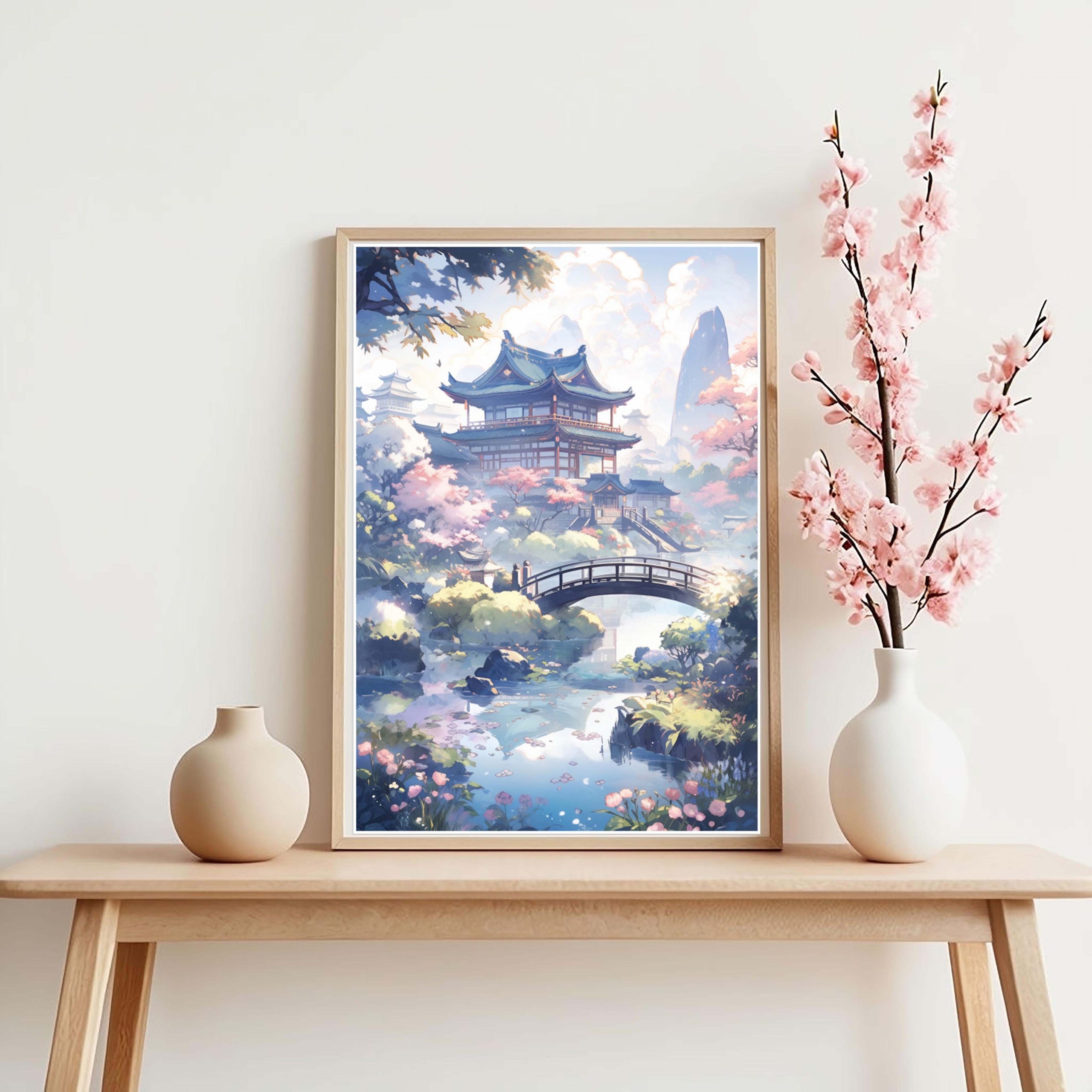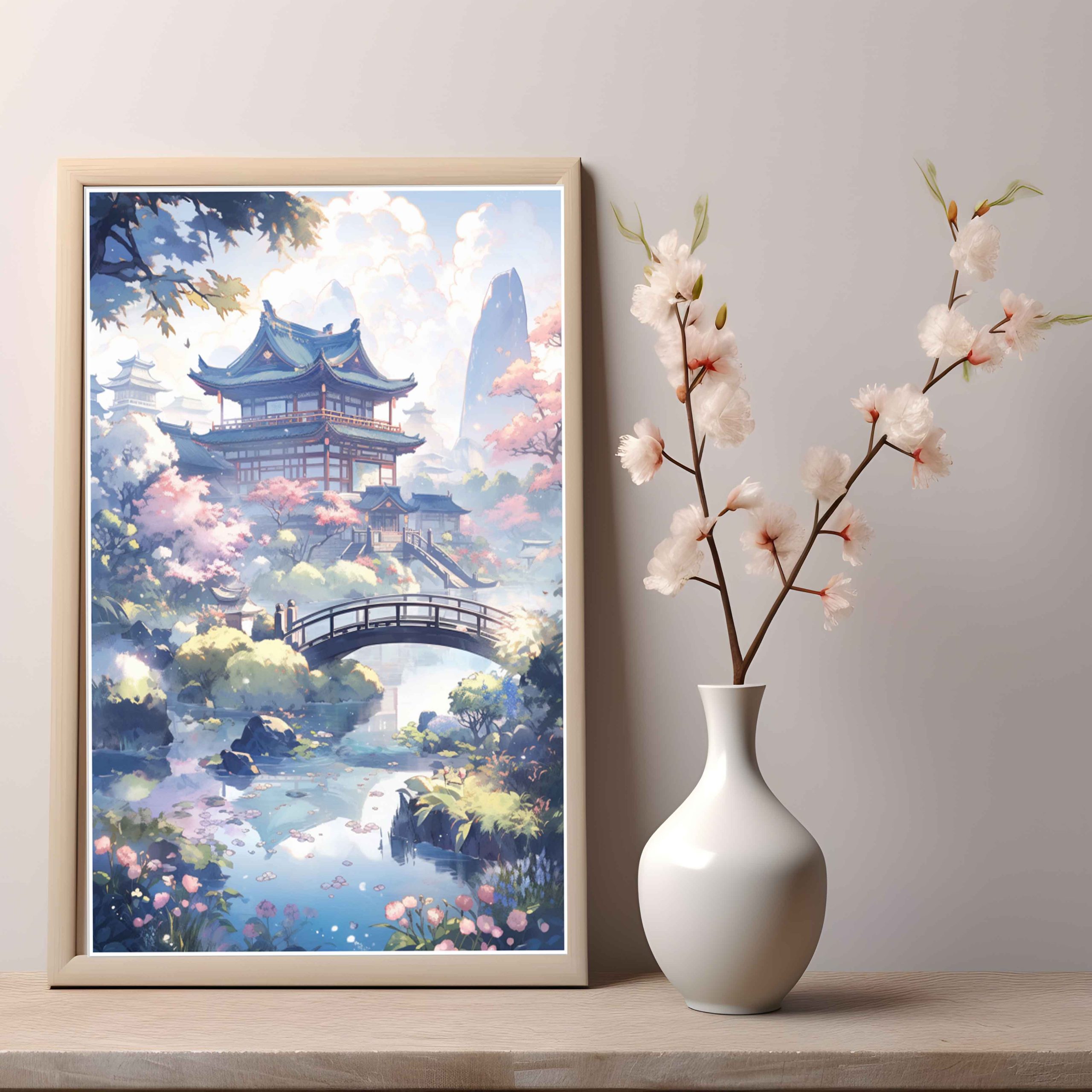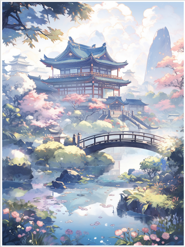 Peinture-paysage-Japonais-avec-pont-pagode