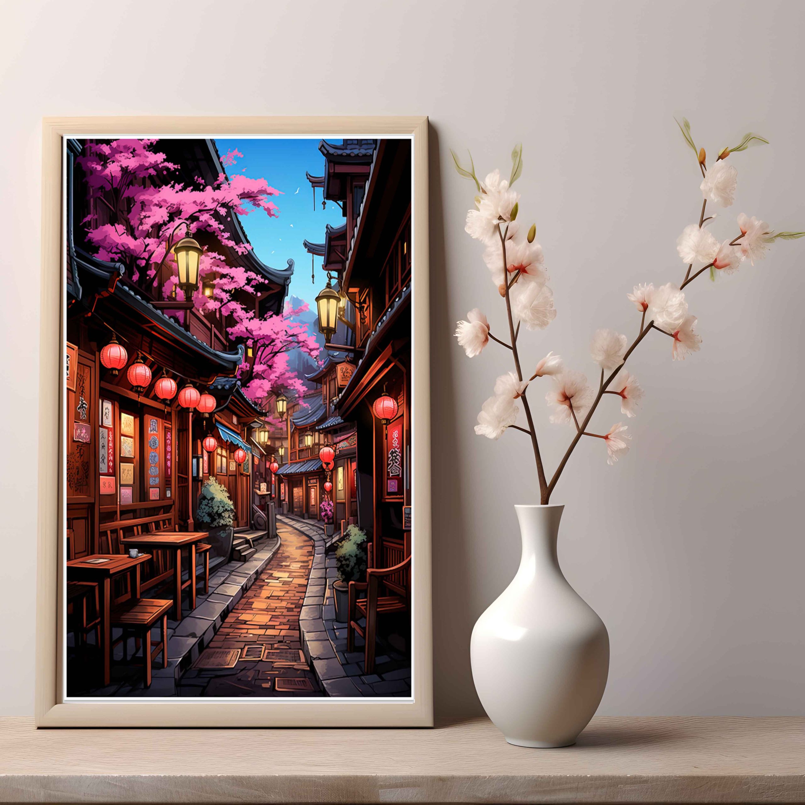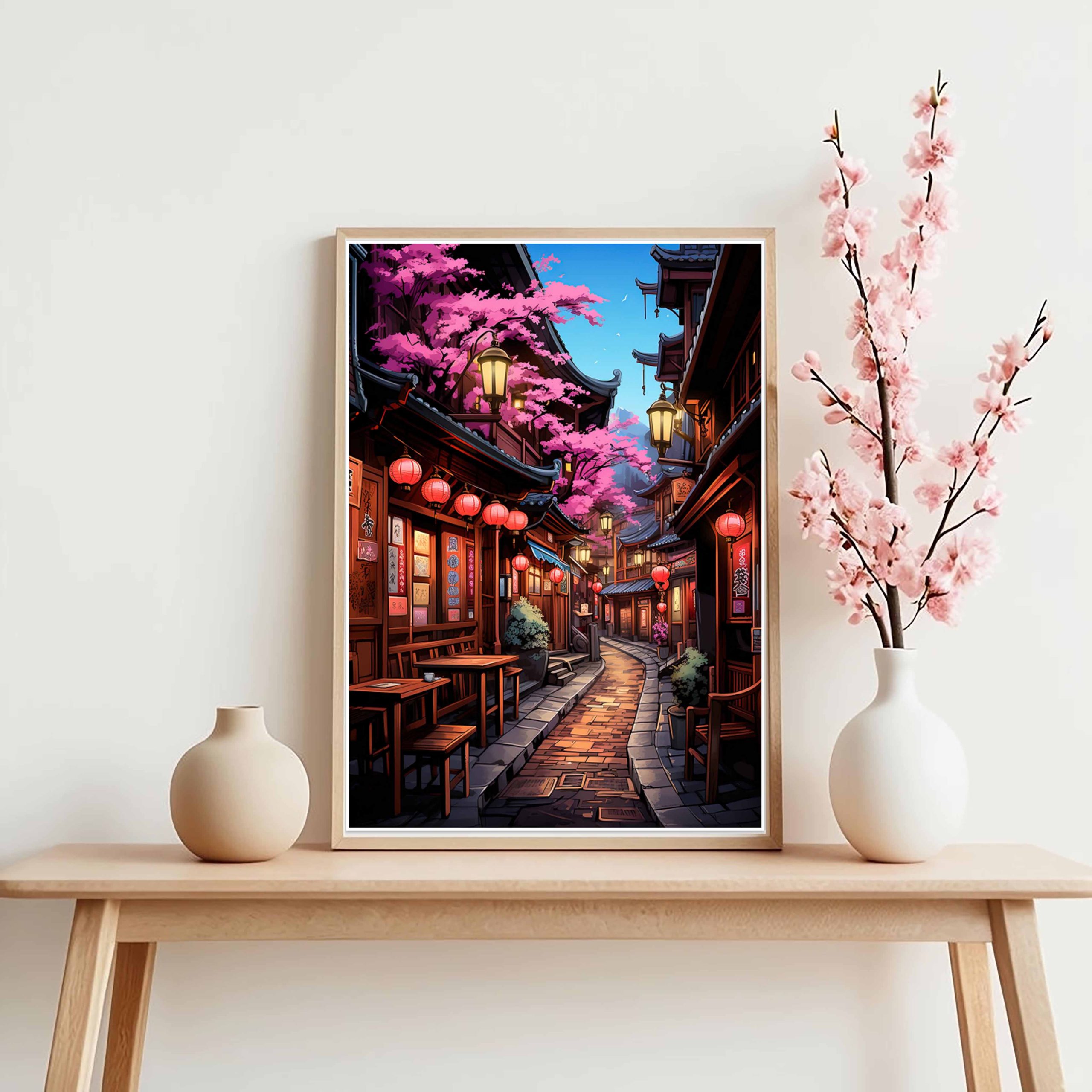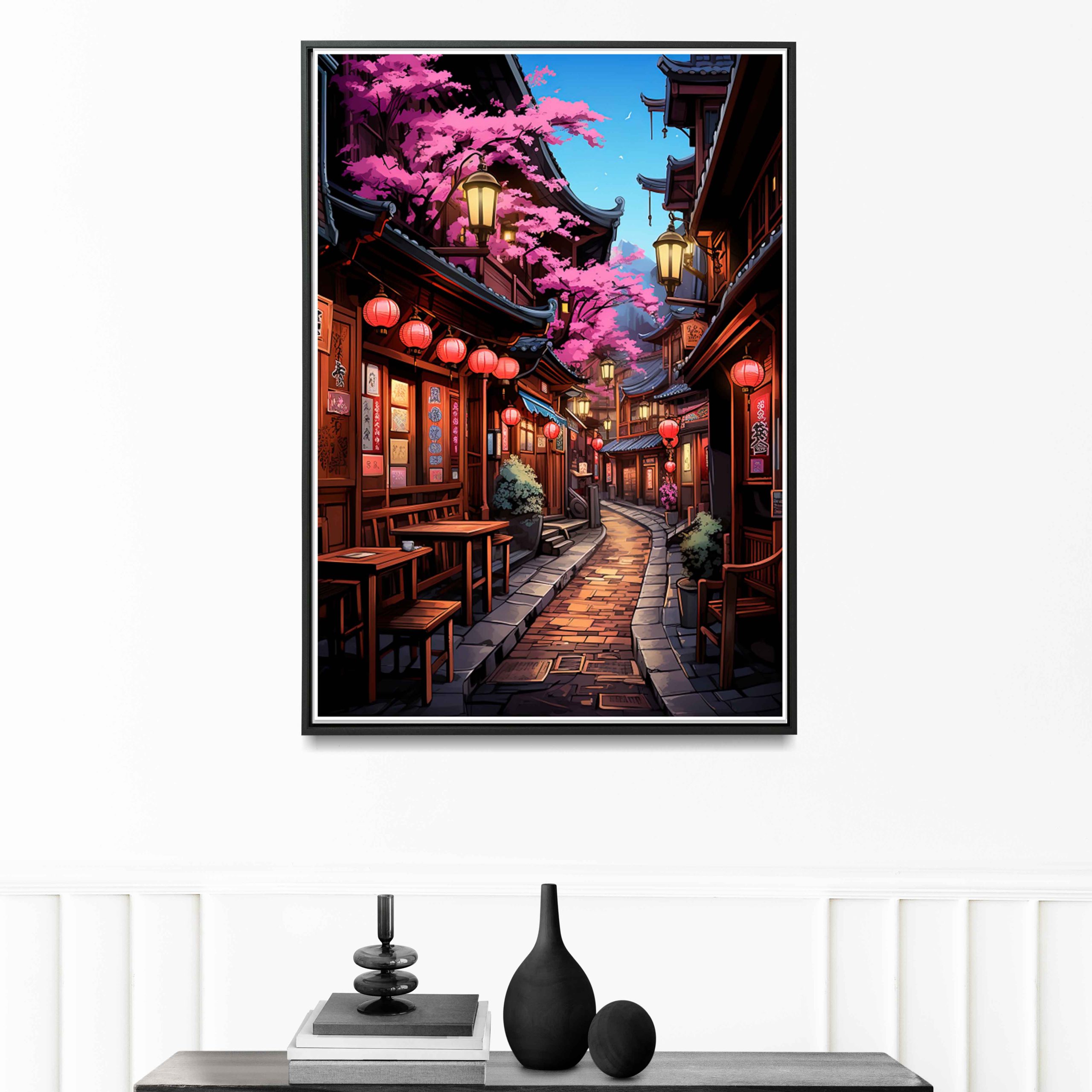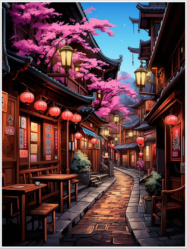 Peinture-rue-avec-bâtiment-avec-lanternes-panneau-qui-dit-lanterne