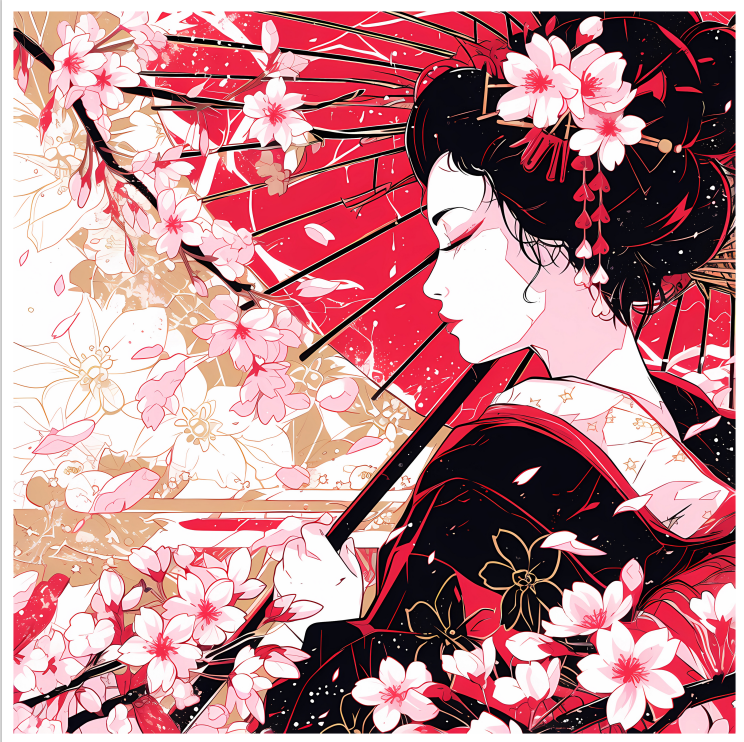 Silhouette élégante de geisha avec fleurs roses, art traditionnel japonais, style ukiyoe